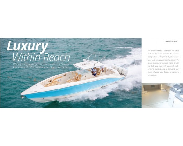 2026 Concept 44' CC(4) Mercury 400s Great fishing vessle and very affordableExpress Your StyleFor added comfort, a bathroom and small bed can be found beneath the console along with a well-appointed galley. Equip your boat with a generator, flat screen TV, sound system, lighting and more. Create the custom look you want with sun deck cushions and lounge seating on deck, and your choice of wood grain flooring or carpeting in the cabin.When it comes to power choose from triple or quad 350 hp outboards, or go big with twin or triple Seven Marine 600+ hphigh-performance motors. |